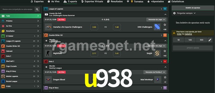 O u938 oferece uma grande seleção de opções de apostas em e-sports com probabilidades competitivas